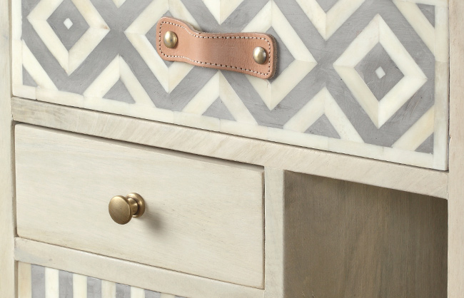 Columna en madera maciza (mango), 5 cajones, 1 puerta, 2 huecos (frontales de cajones hechos en resina y hueso, tiradores en piel)