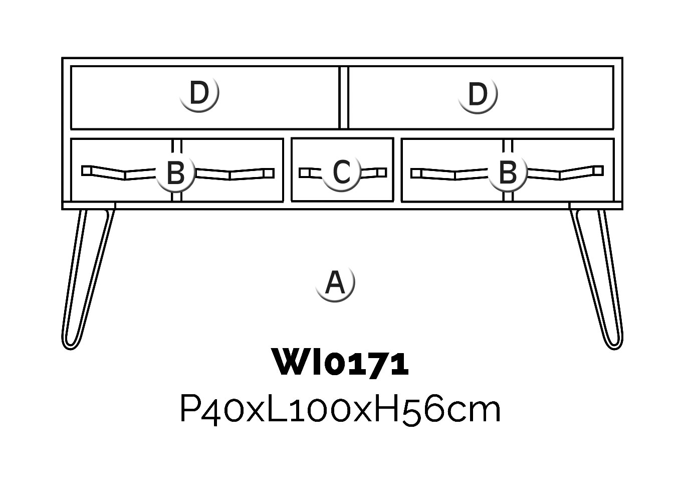 Mueble TV con 3 cajones en madera maciza (mango), patas de metal